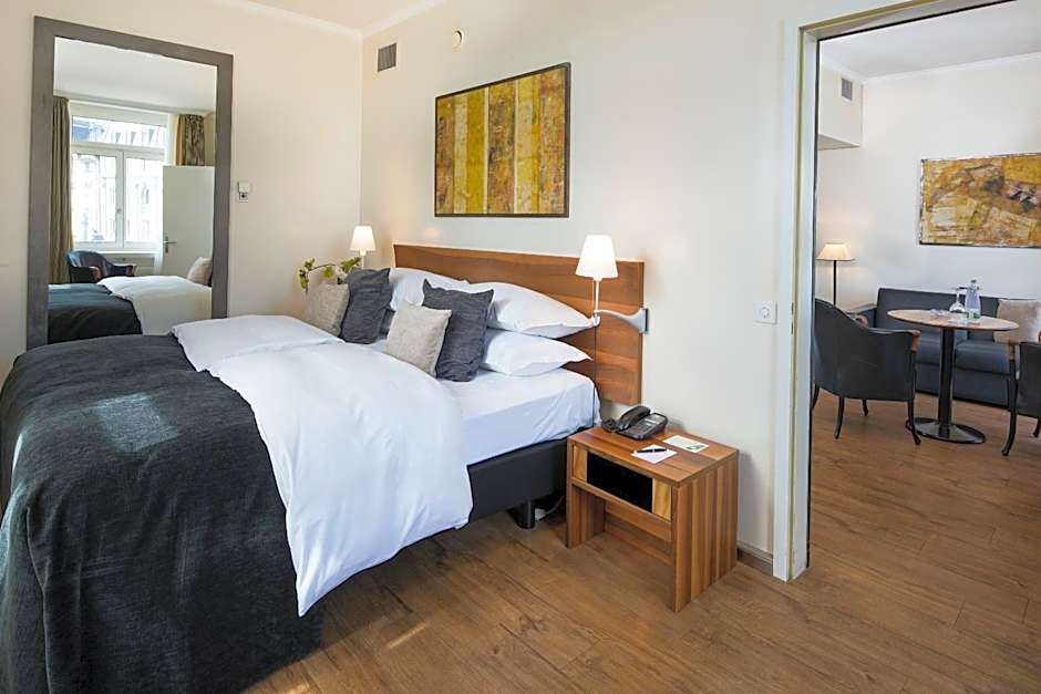 Large suite with a bedroom and a living room. It offers a coffee machine (free), two single beds (2 x 3.3 foot) and panoramic views of the Central Square and the Limmat River.