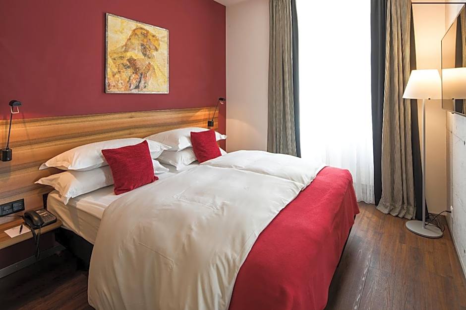 Spacious junior suite offers a coffee machine (free), two single beds (2 x 3.3 foot) and panoramic views of the Central Square and the Limmat River.